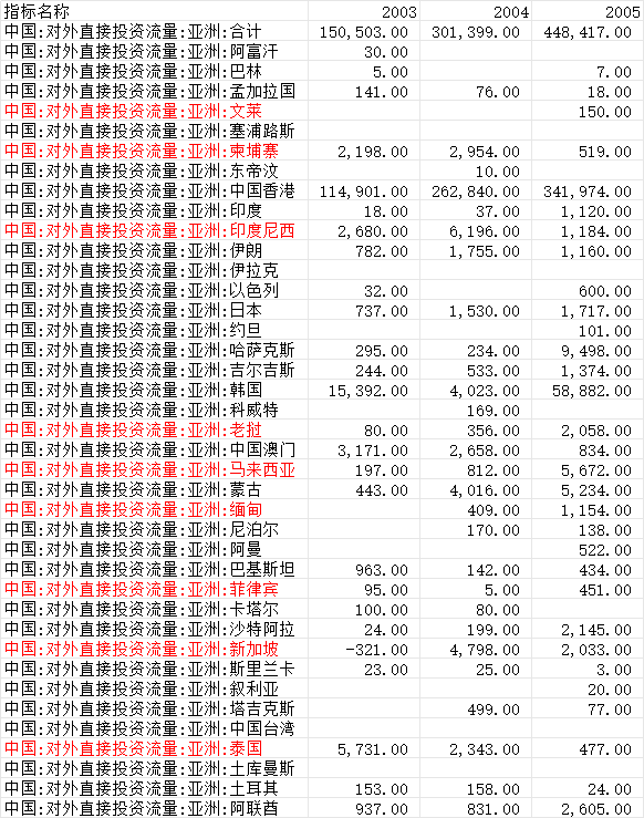 中国对外投资流量分国家 2003~2024,共包含160+个国家或地区(亚洲、非洲等),请注意早年有很多国家没有公布,2003年100个左右地区有数据,2010年150个左右地区有数据,2024年160个左右地区有数据。