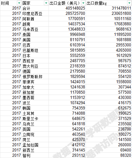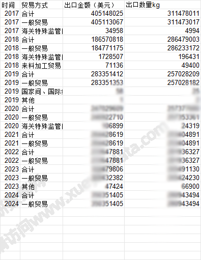 时间 出口国家 种类 贸易方式 出口金额(美元) 出口数量kg