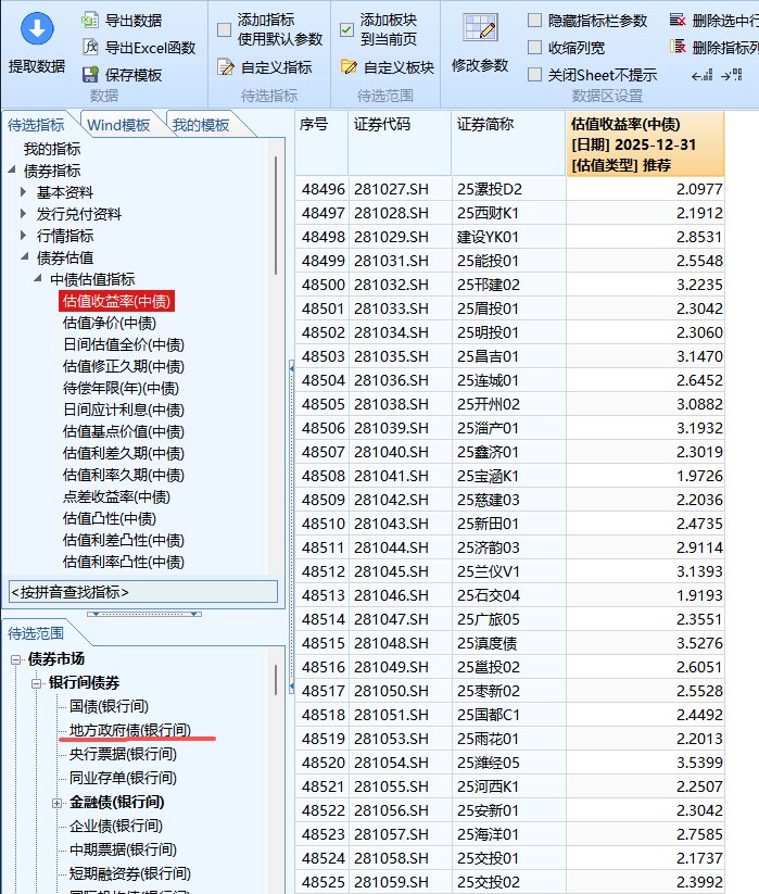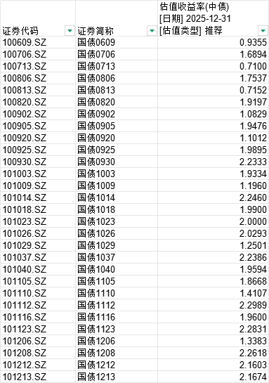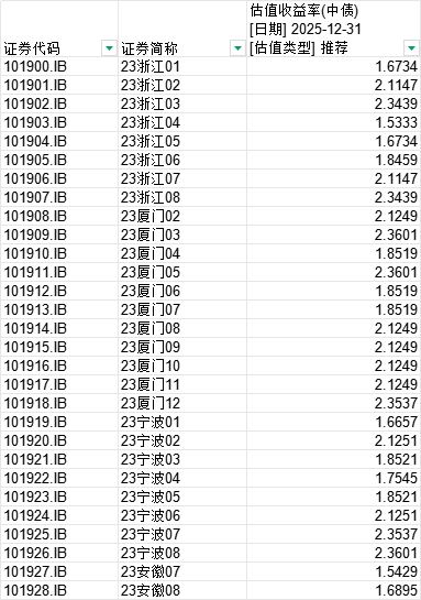 中债估值收益率 20251231 60000+只债券 这是第二部分,数据提取于2026年1月8日,不含此日前已经摘牌到期的债券,债券类型包括地方政府债、上交所债券、深交所债券、北交所债券、柜台市场债券,共60000+只,数据来自wind。其他类型银行间市场债券请前往学研数据网《中债估值收益率 20251231 近30000只债券》购买。