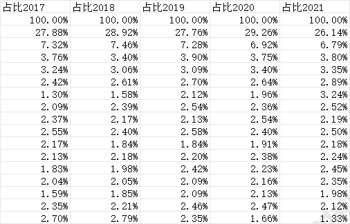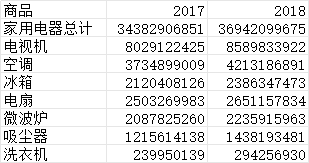 由于家电种类较多,分种类数据只列举电视机、空调、冰箱、电扇、微波炉、吸尘器、洗衣机这7类。