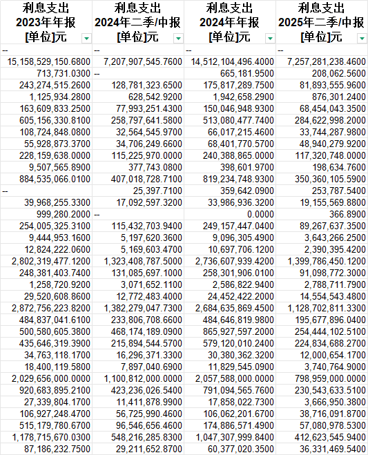全部A股利息支出2010~2025半年度,样本量比较全,2015年3500+公司披露数据,2020年4730家公司披露数据,早年没披露数据的公司是因为还没上市。另外请注意,本数据不含金融业。