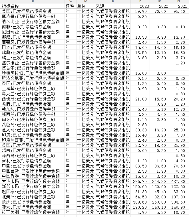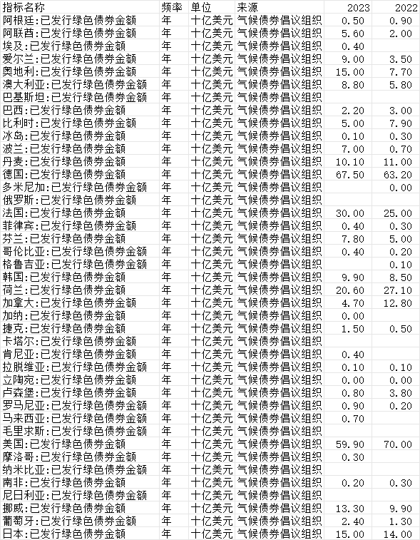世界各国绿色债券发行额2014~2023年,共73个国家/地区。数据来源气候债券倡议组织。