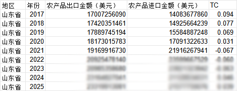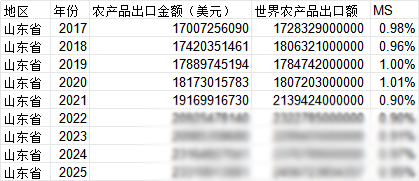 山东农产品出口 TC RCA MS指数 2017~2025,注意2025年由于世界农产品和世界出口总额没有发布,为测算数据,不影响使用。