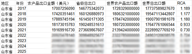 地区 年份 农产品出口金额(美元) 农产品进口额 省级总出口 世界农产品出口额 世界总出口额 RCA TC MS指数