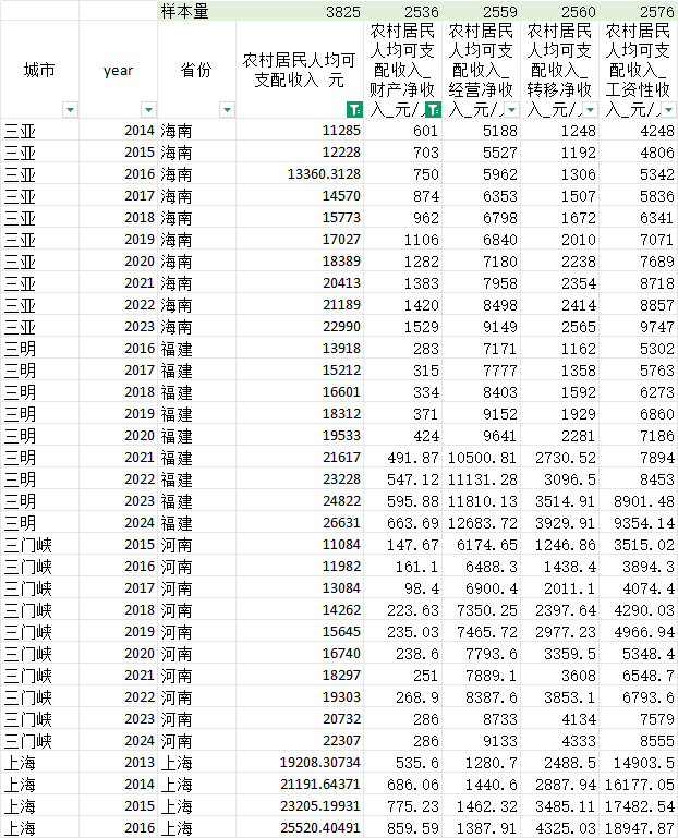 城市 year 省份 农村居民人均可支配收入 元 农村居民人均可支配收入_财产净收入_元/人 农村居民人均可支配收入_经营净收入_元/人 农村居民人均可支配收入_转移净收入_元/人 农村居民人均可支配收入_工资性收入_元/人