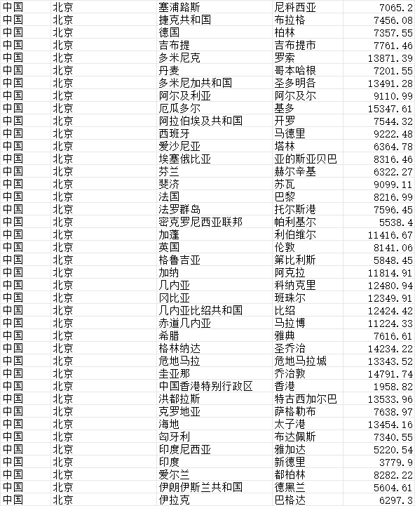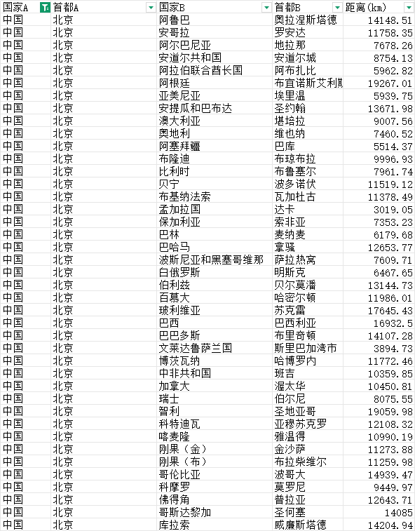 国家A 首都A 国家B 首都B 距离(km)