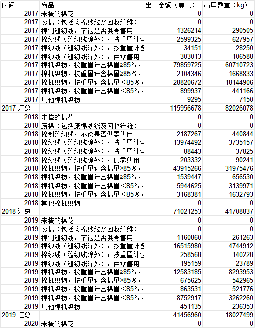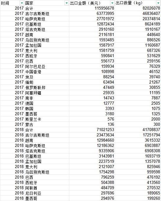 时间 国家 种类 出口金额(美元) 出口数量(kg)