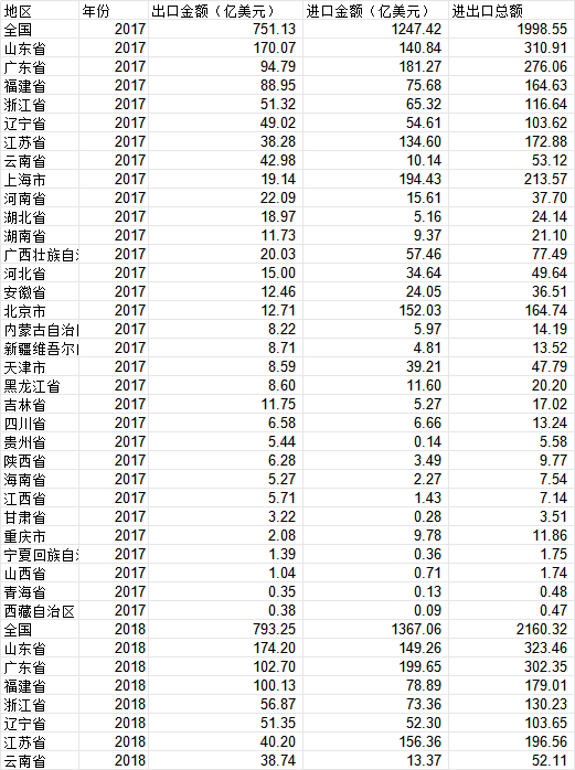 各省份农产品进出口总额 2017~2025,包含进口和出口金额,单位亿美元,31个省份,数据没有缺失,更新于2026年4月。