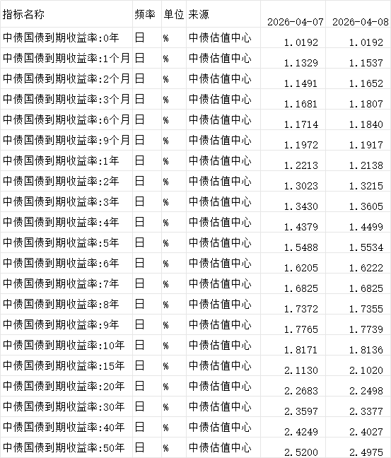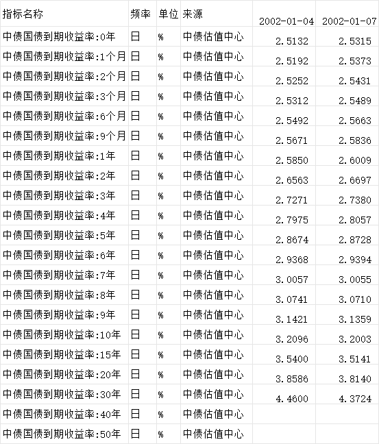中债国债到期收益率 2002~2026.4 日度,期限分成0 年、1 个月、2 个月、3 个月、6 个月、9 个月、1 年、2 年、3 年、4 年、5 年、6 年、7 年、8 年、9 年、10 年、15 年、20 年、30 年、40 年、50 年,注意其中40年、50年期的从2010年开始。