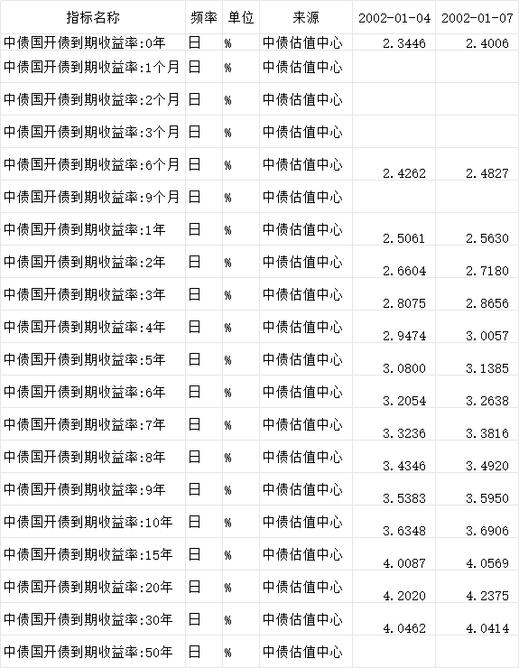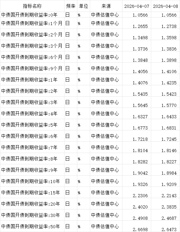 中债国开债到期收益率 2002~2026.3 日度,分成0 年、1 个月、2 个月、3 个月、6 个月、9 个月、1 年、2 年、3 年、4 年、5 年、6 年、7 年、8 年、9 年、10 年、15 年、20 年、30 年、50 年20个收益率曲线。更新到2026年4月8日。