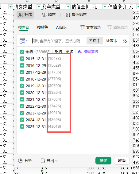 全国银行间同业拆借中心债券估值 2015~2025,估值采用每年年末最后一个交易日的估值,样本量如图,共339000+条估值记录。如果你指定必须要某个债券的估值就联系客服定制,银行间同业拆借中心的样本覆盖量不如中债估值大,如果你需要中债估值,也请私信定制。由于数据量较大并且数据权限要求很高,价格会很高。