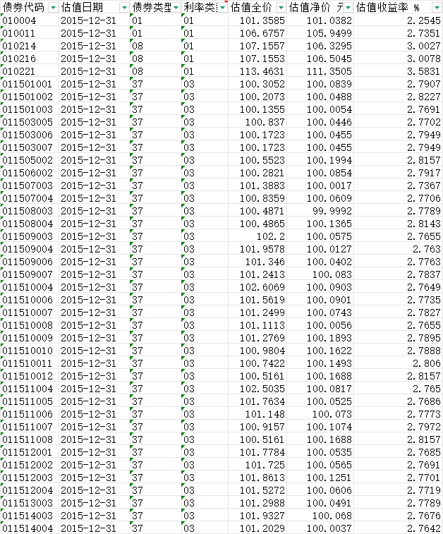 债券代码 估值日期 债券类型 利率类型 估值全价 元 估值净价 元 估值收益率 %