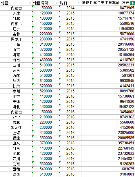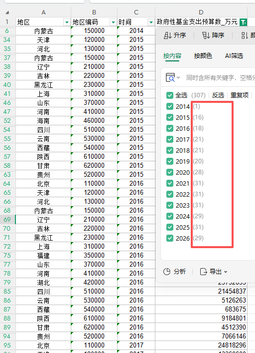各省市政府性基金支出预算数 2015~2026,各年份样本量如图