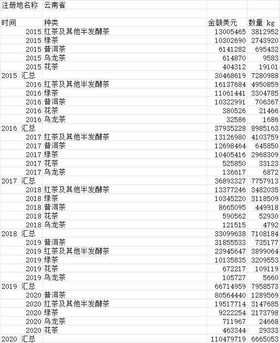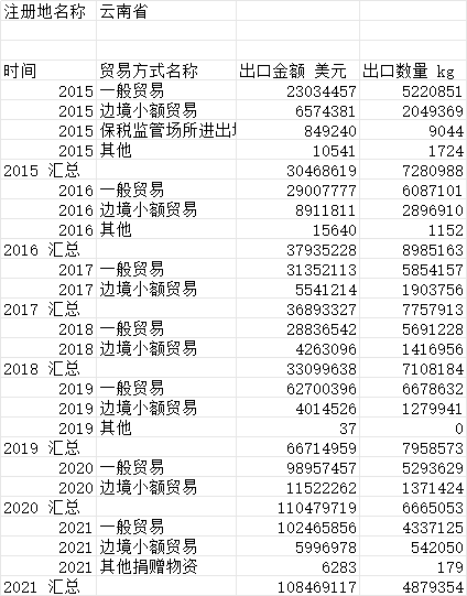 云南省茶叶出口分市场分种类分贸易方式2015~2025,更新到2025年
