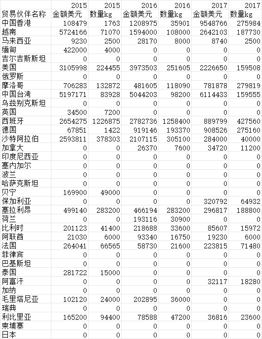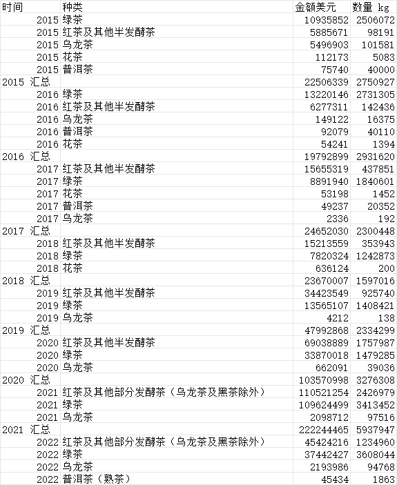 出口国家 茶叶种类 贸易方式 出口金额 出口数量